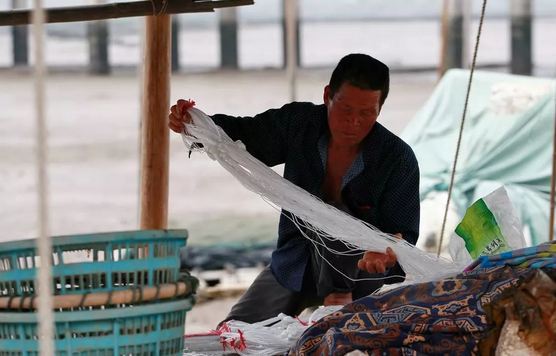 閑暇時,上岸船平易近在織補漁網。喻捷 攝影
